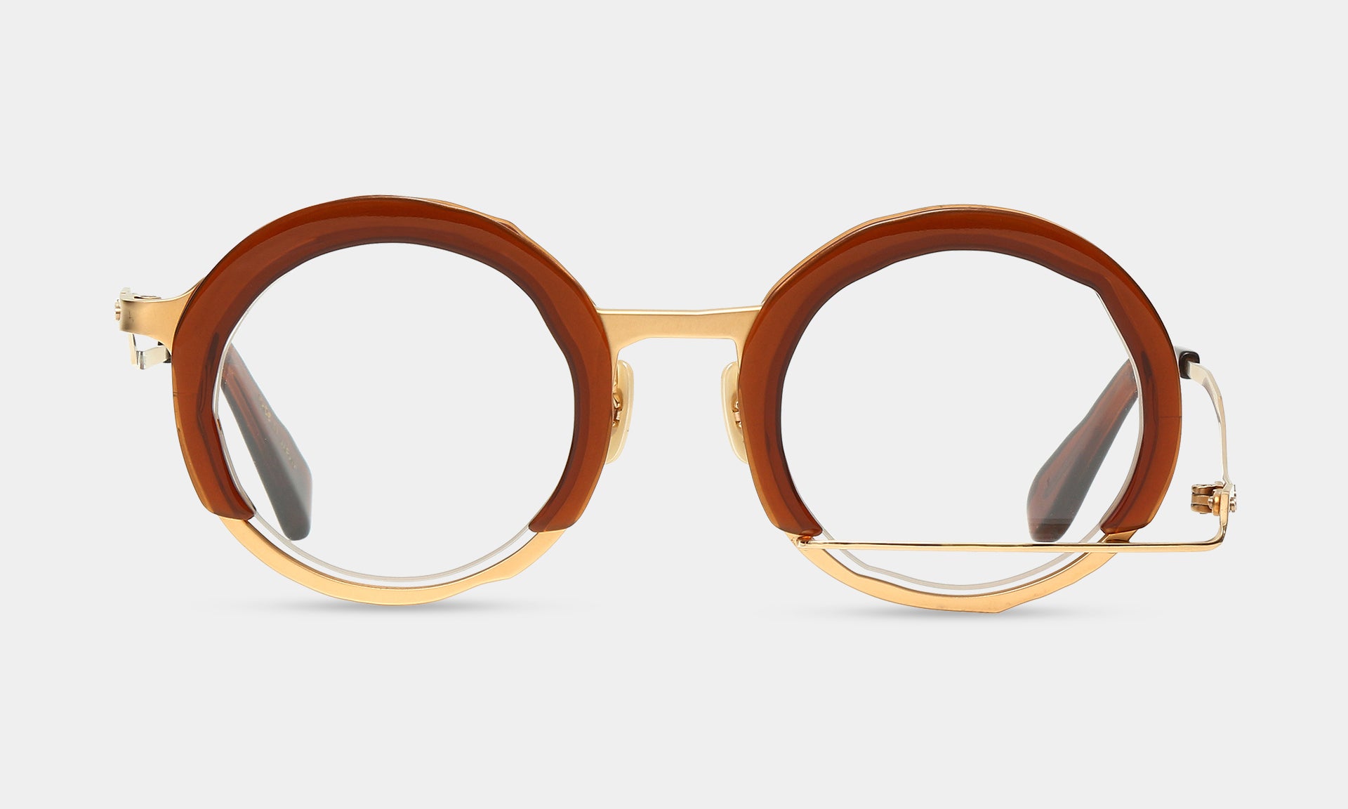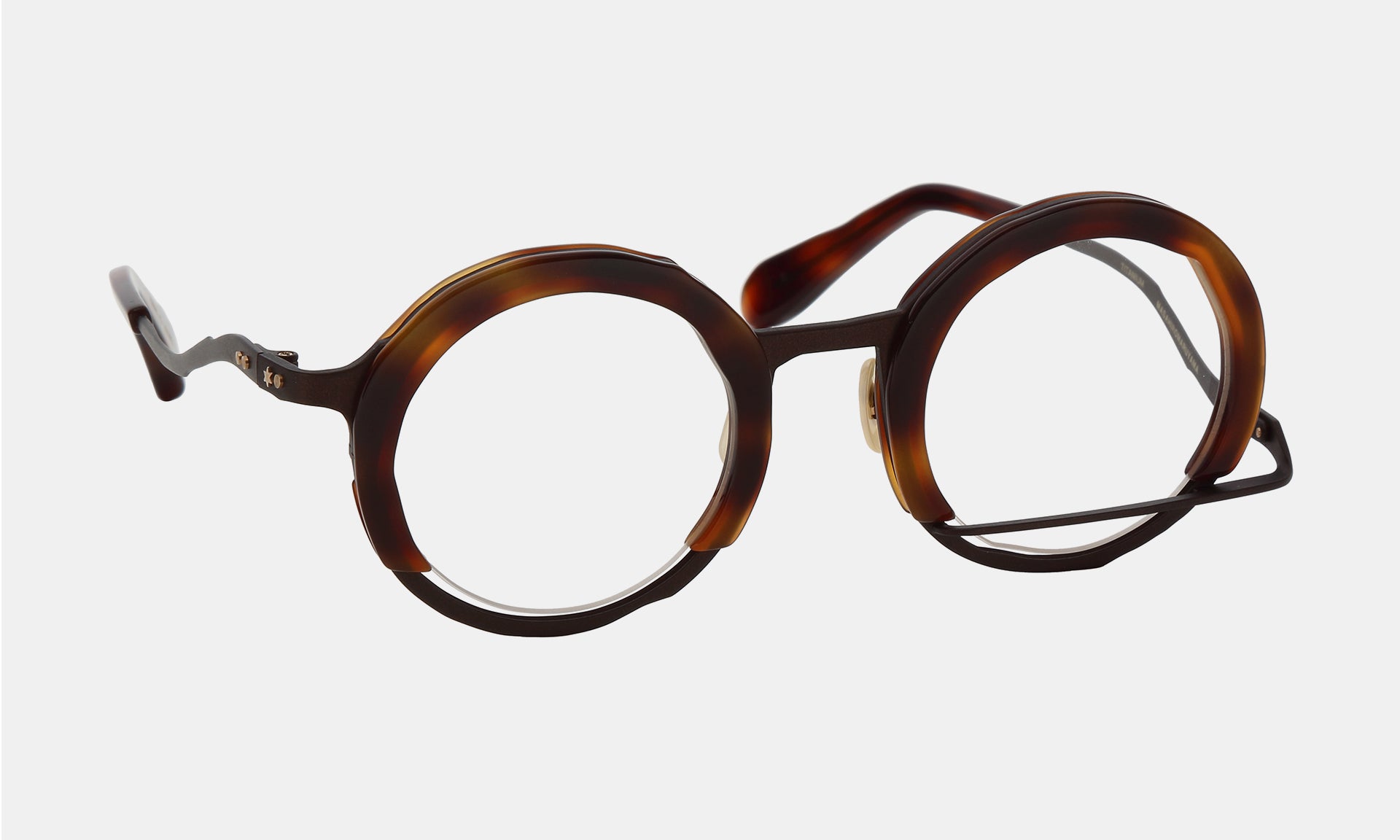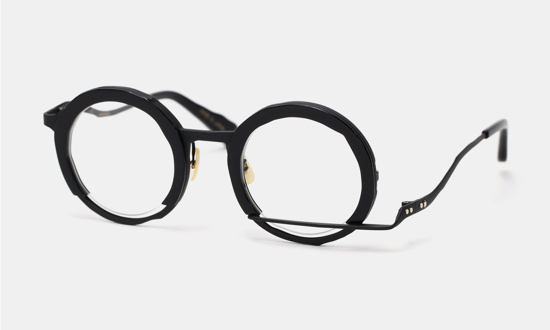 消しゴムで鉛筆のラインを消したイメージをメガネのデザインとして表現。パーツの配置の常識を大胆に消し、その後に力強く引かれたアンダーラインが特徴的です。正面のみではなく右からも左からも別々の表情が見えるように計算して設計され、一味違った存在感を放ちます。