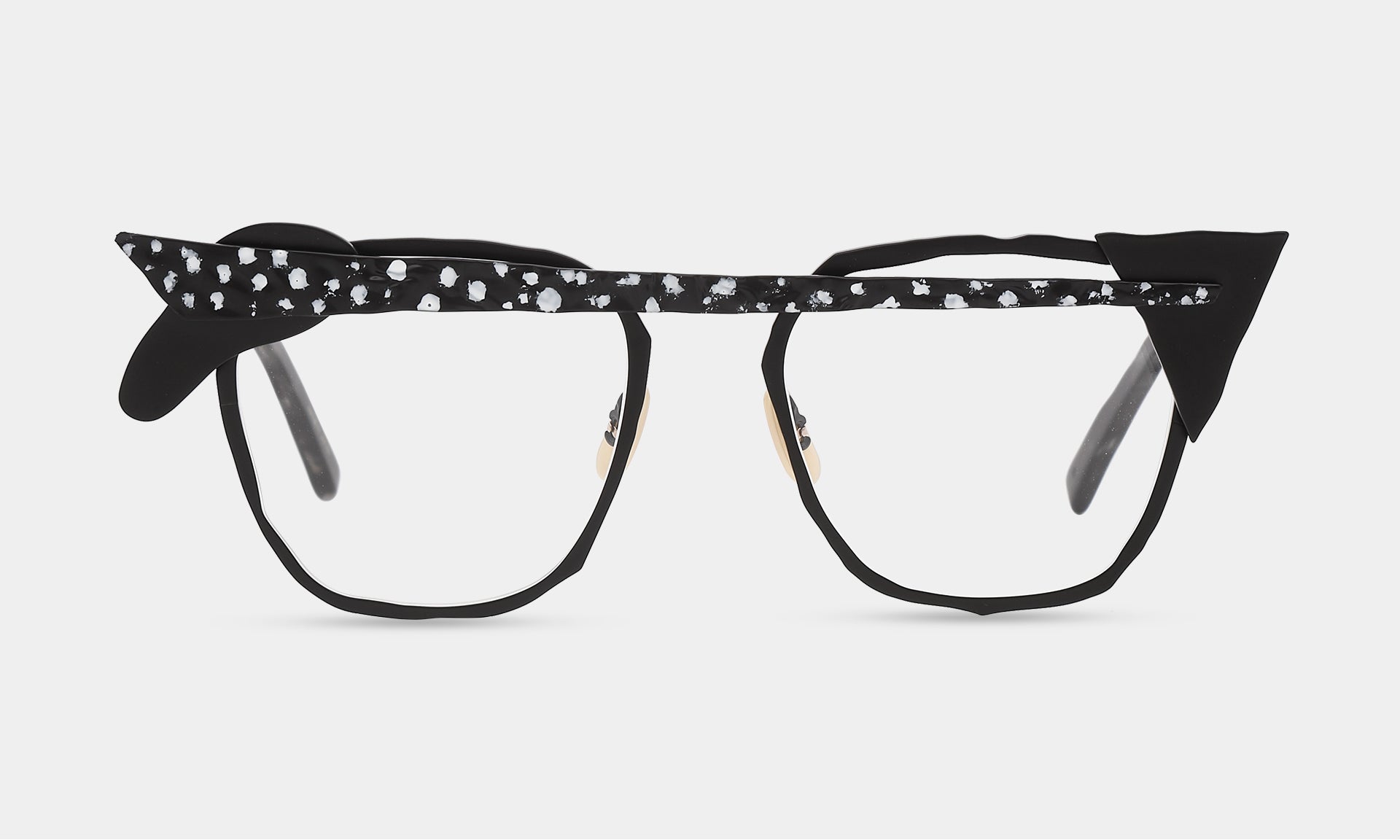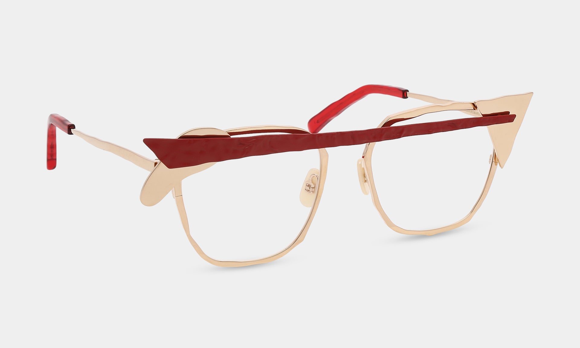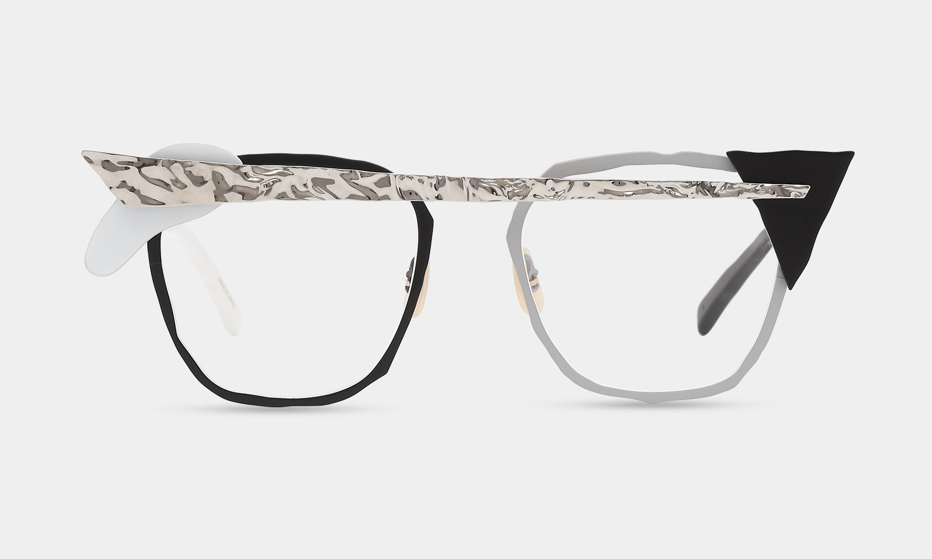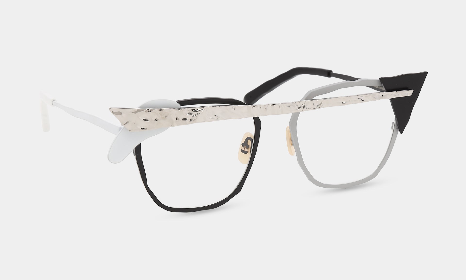 一つひとつのパーツを積み重ねる実験的なデザイン。ヨロイやブリッジを積み木の様に自由に置いてみる。それが構造となりメガネを作り出しています。色や素材感の違うパーツが組み合わさることで、複雑な色彩とだまし絵のような錯覚を生み出します。