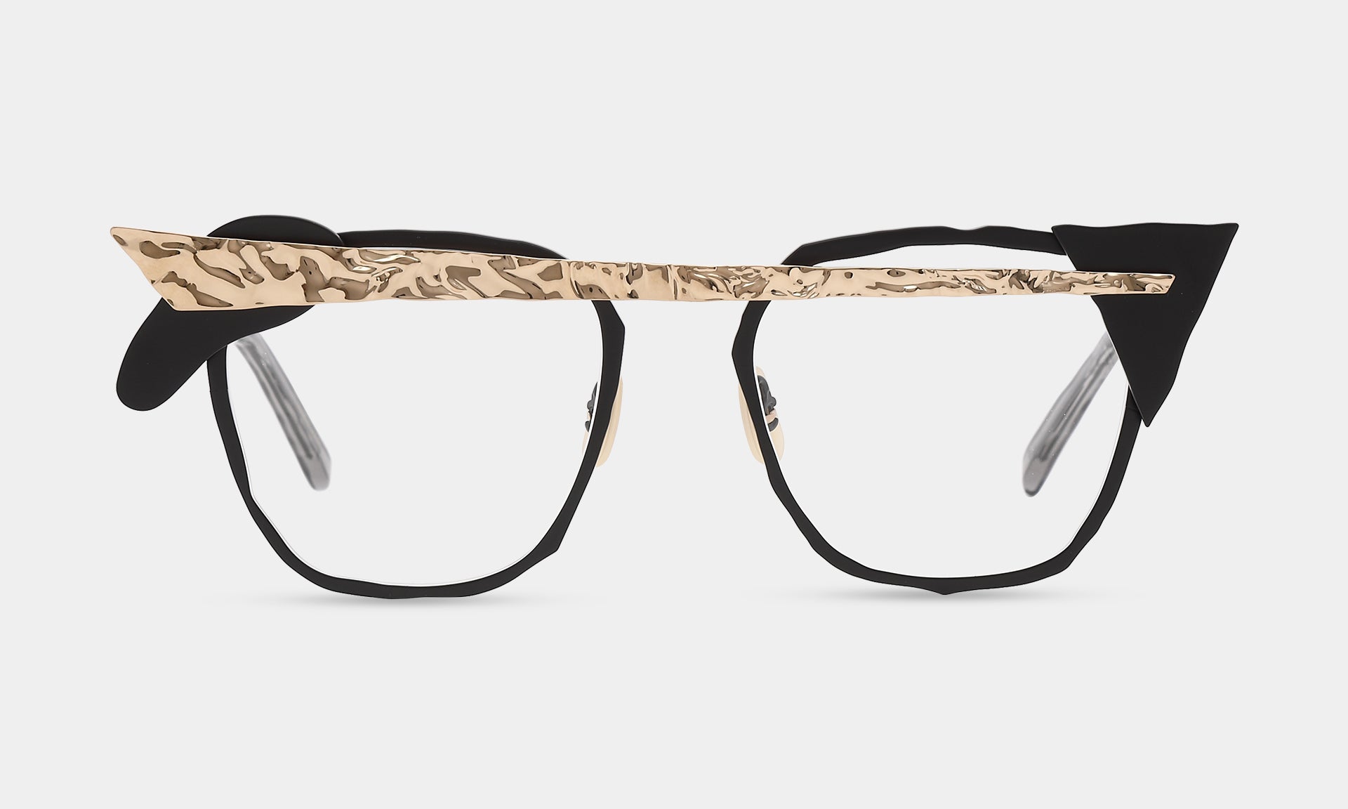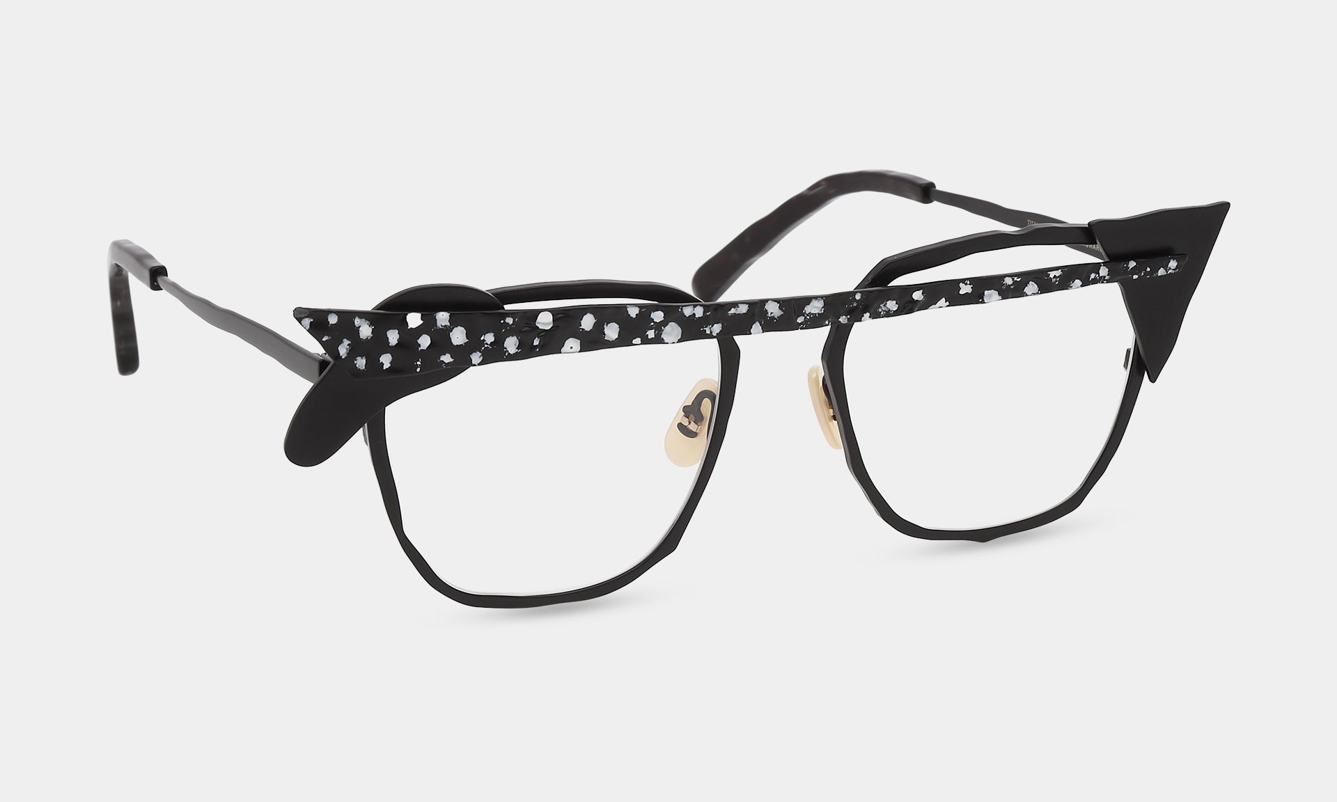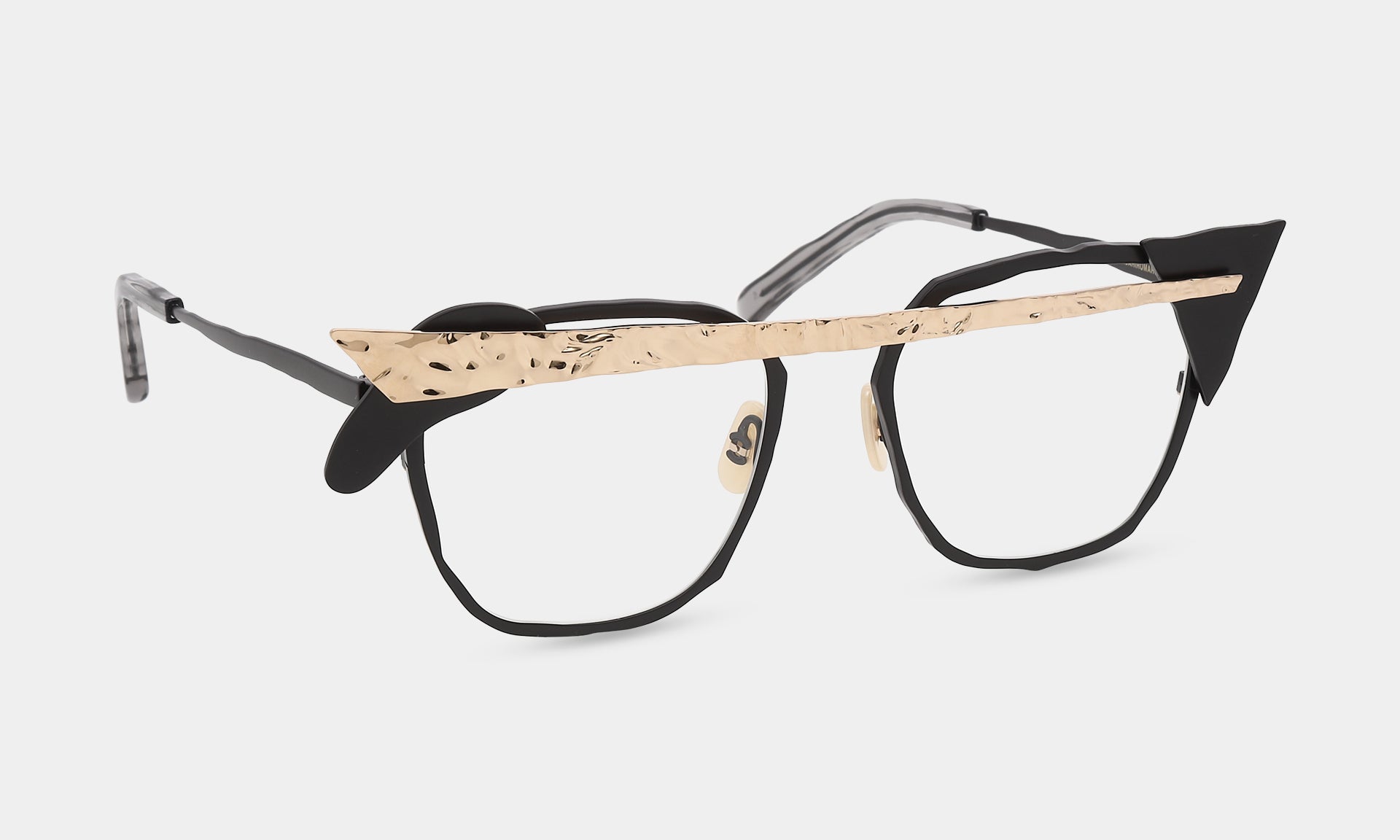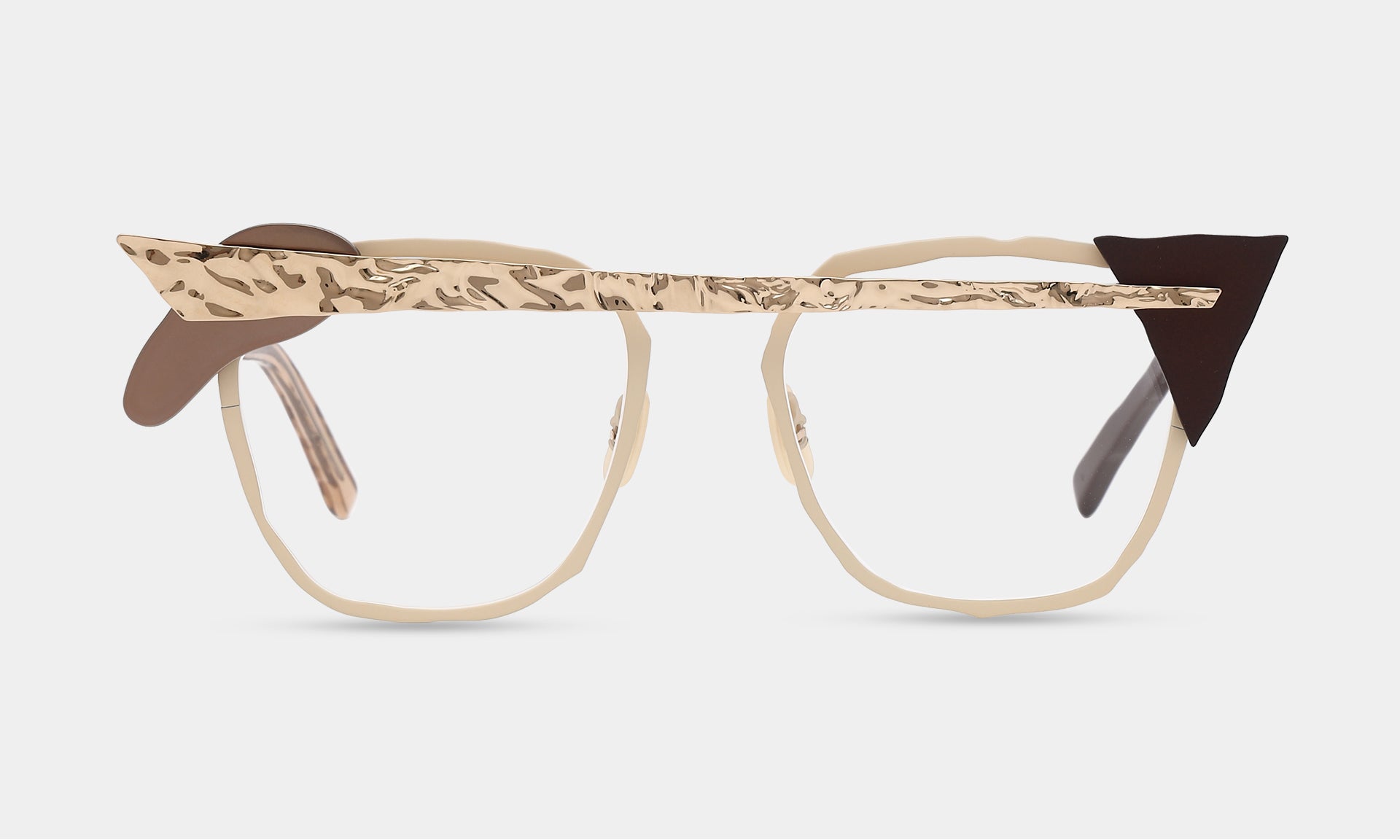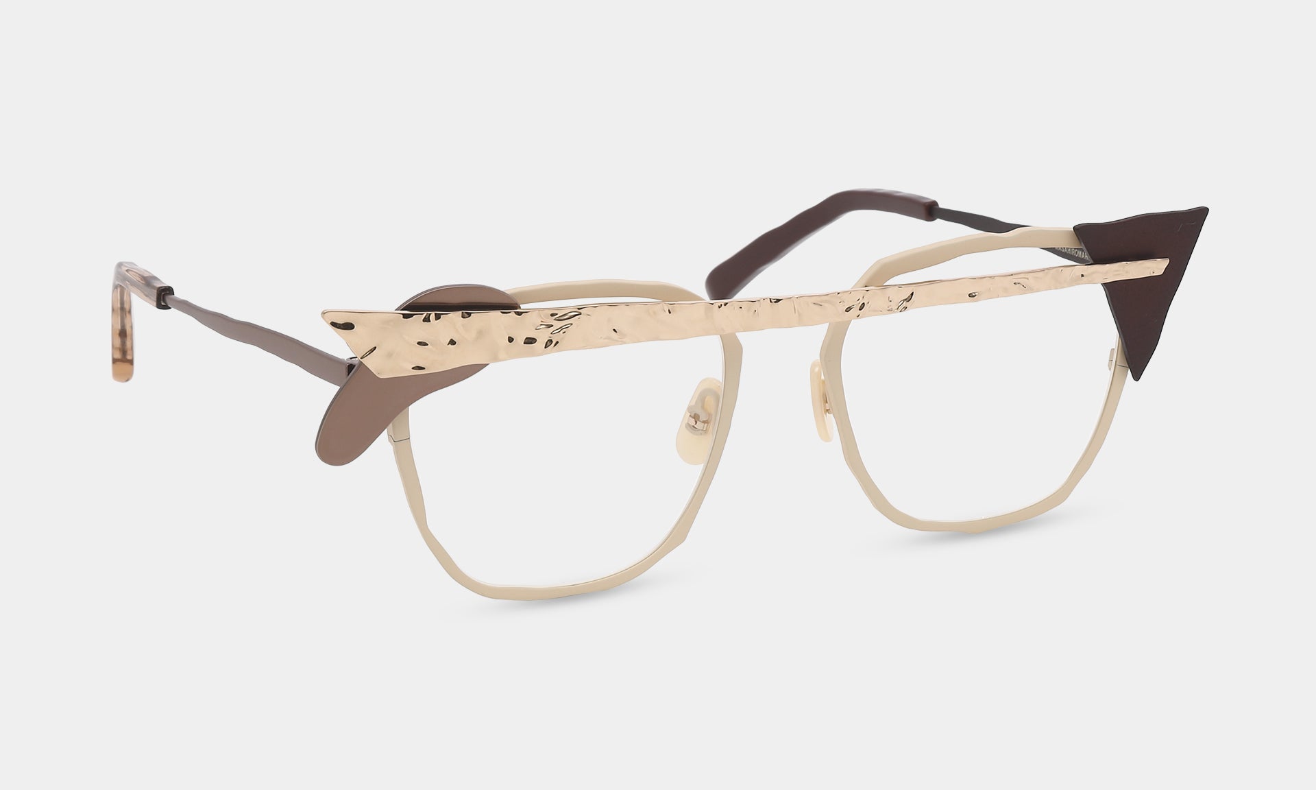 一つひとつのパーツを積み重ねる実験的なデザイン。ヨロイやブリッジを積み木の様に自由に置いてみる。それが構造となりメガネを作り出しています。色や素材感の違うパーツが組み合わさることで、複雑な色彩とだまし絵のような錯覚を生み出します。