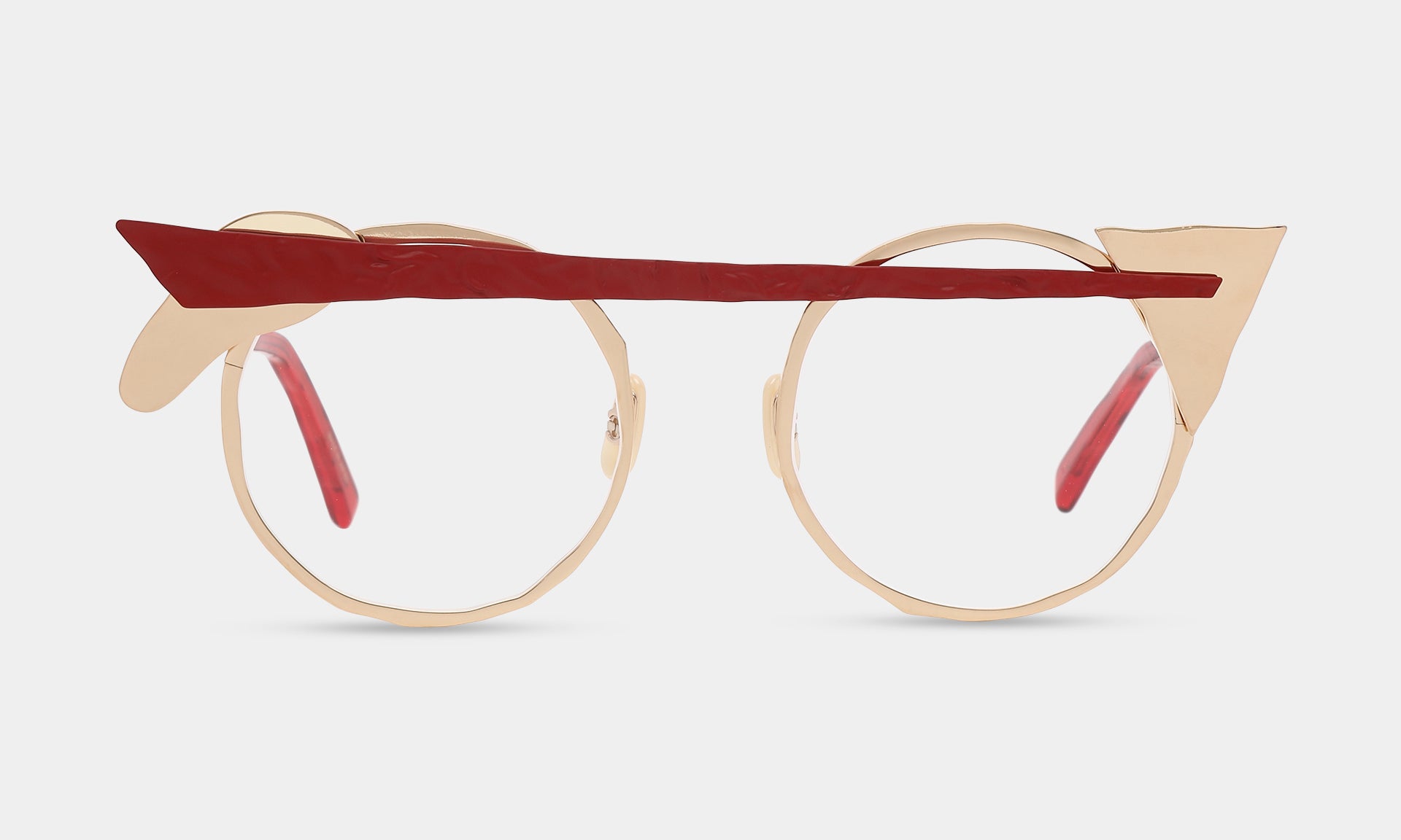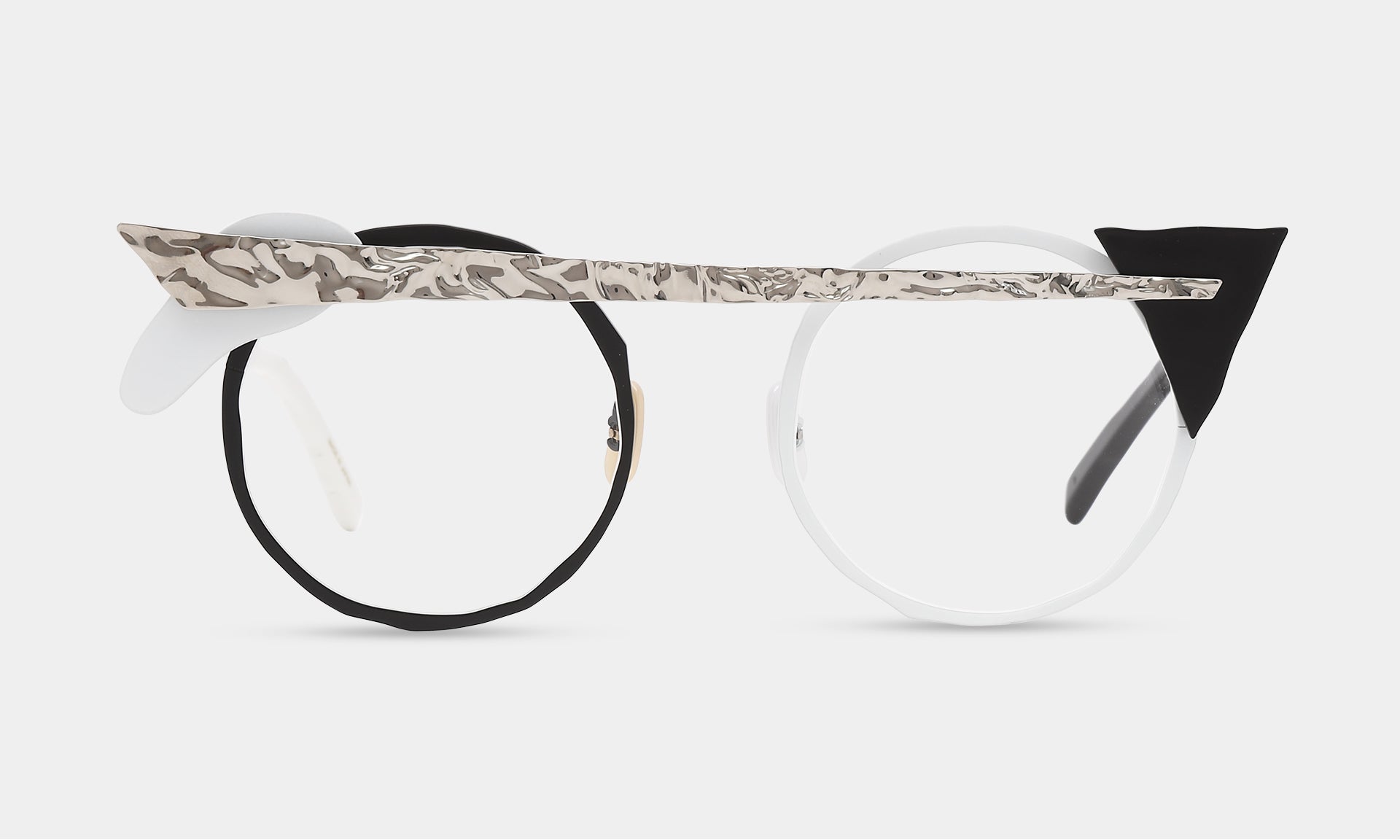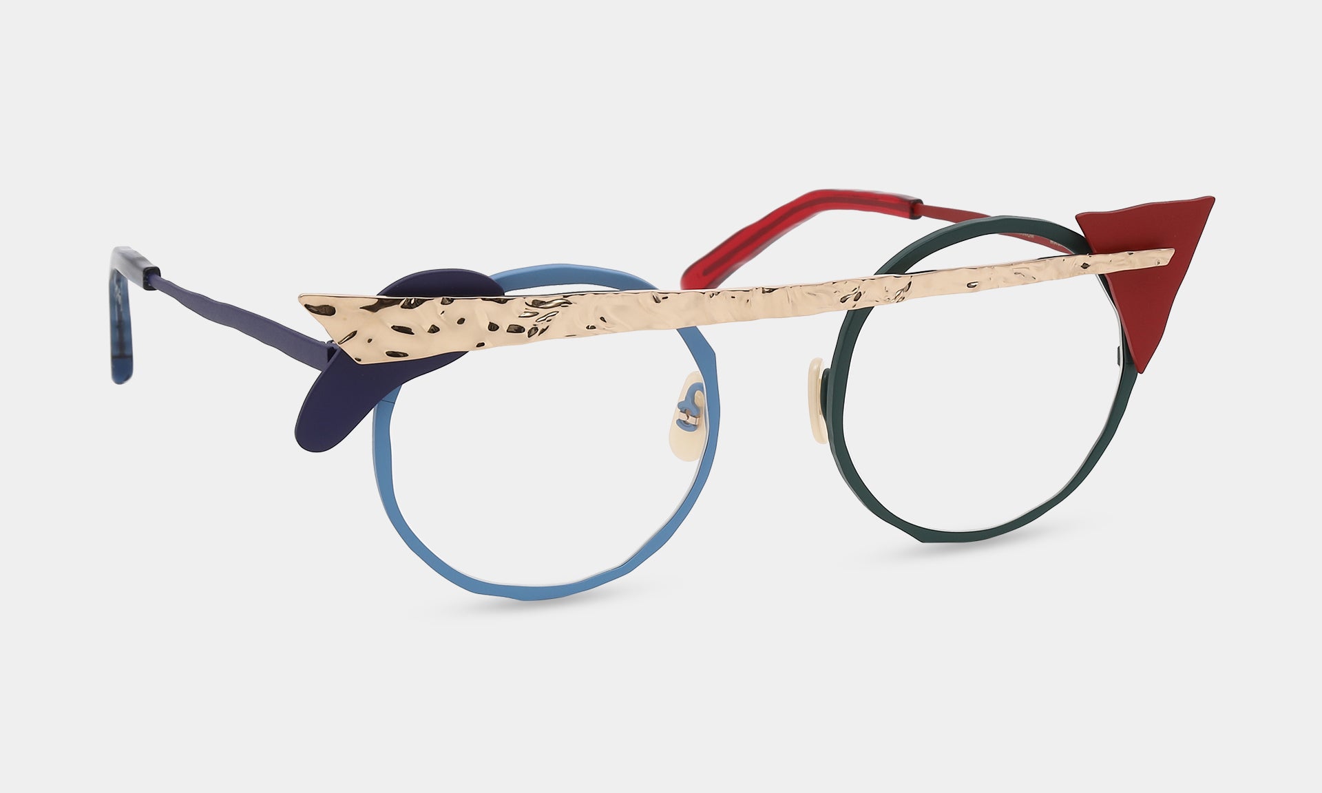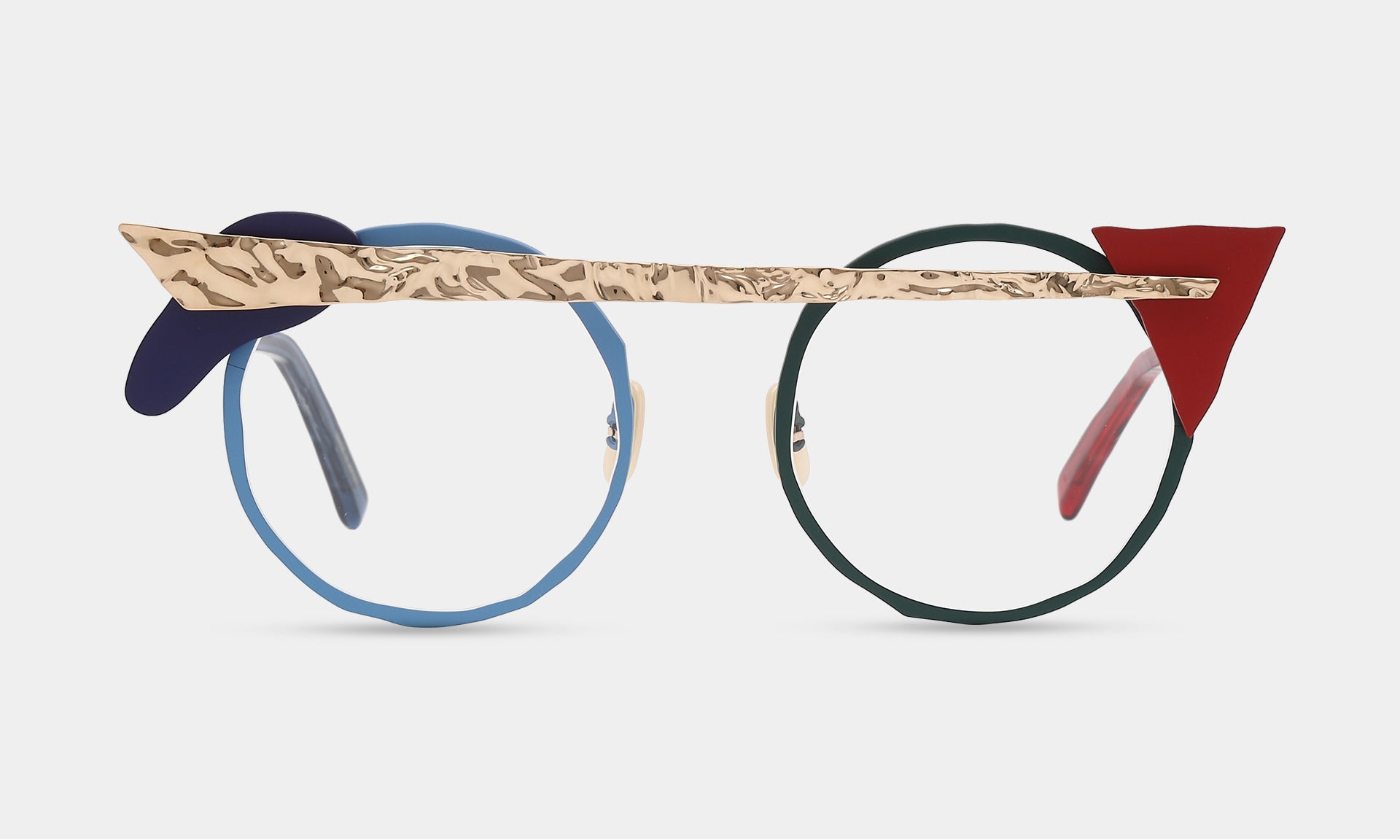 一つひとつのパーツを積み重ねる実験的なデザイン。ヨロイやブリッジを積み木の様に自由に置いてみる。それが構造となりメガネを作り出しています。色や素材感の違うパーツが組み合わさることで、複雑な色彩とだまし絵のような錯覚を生み出します。