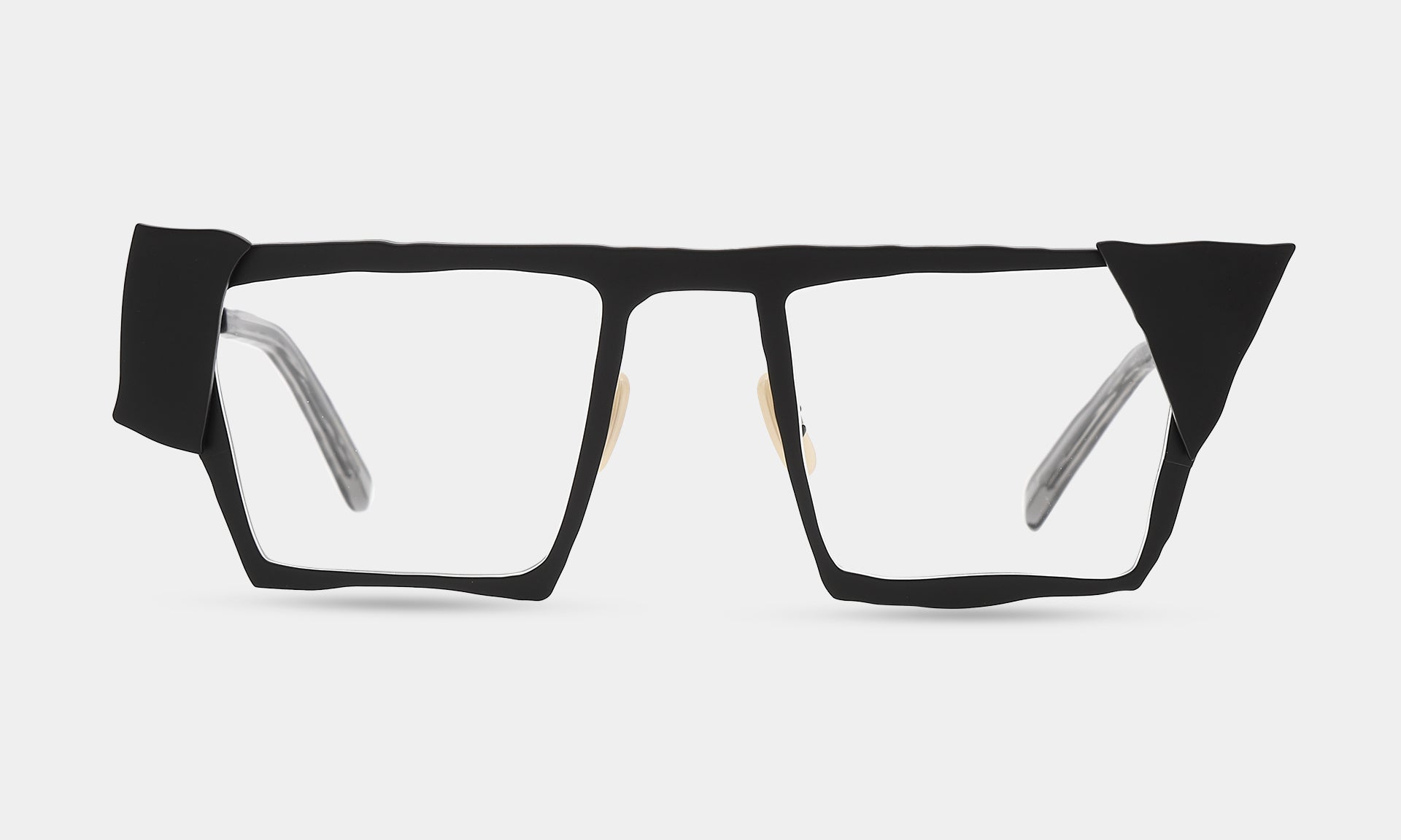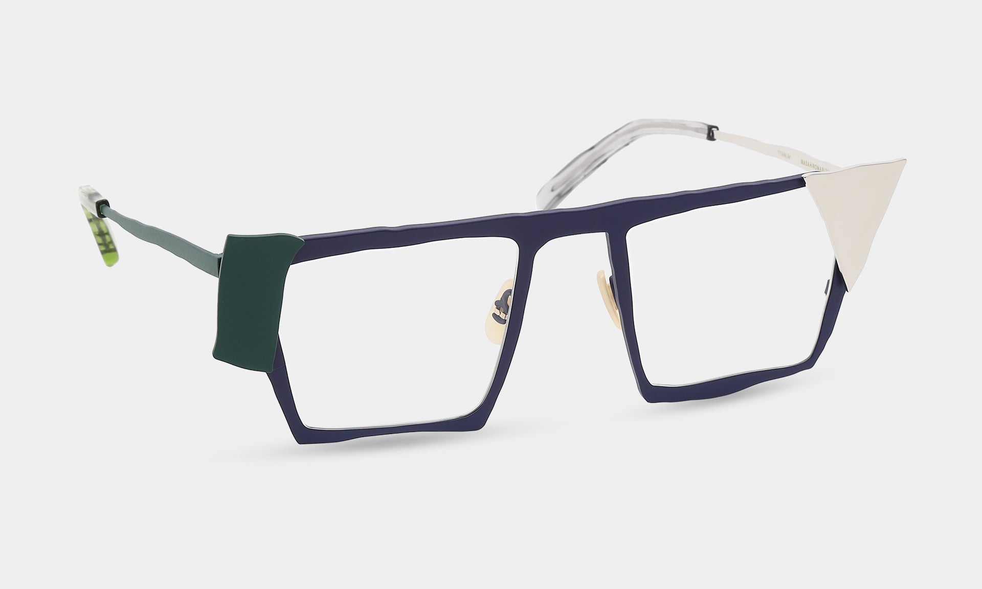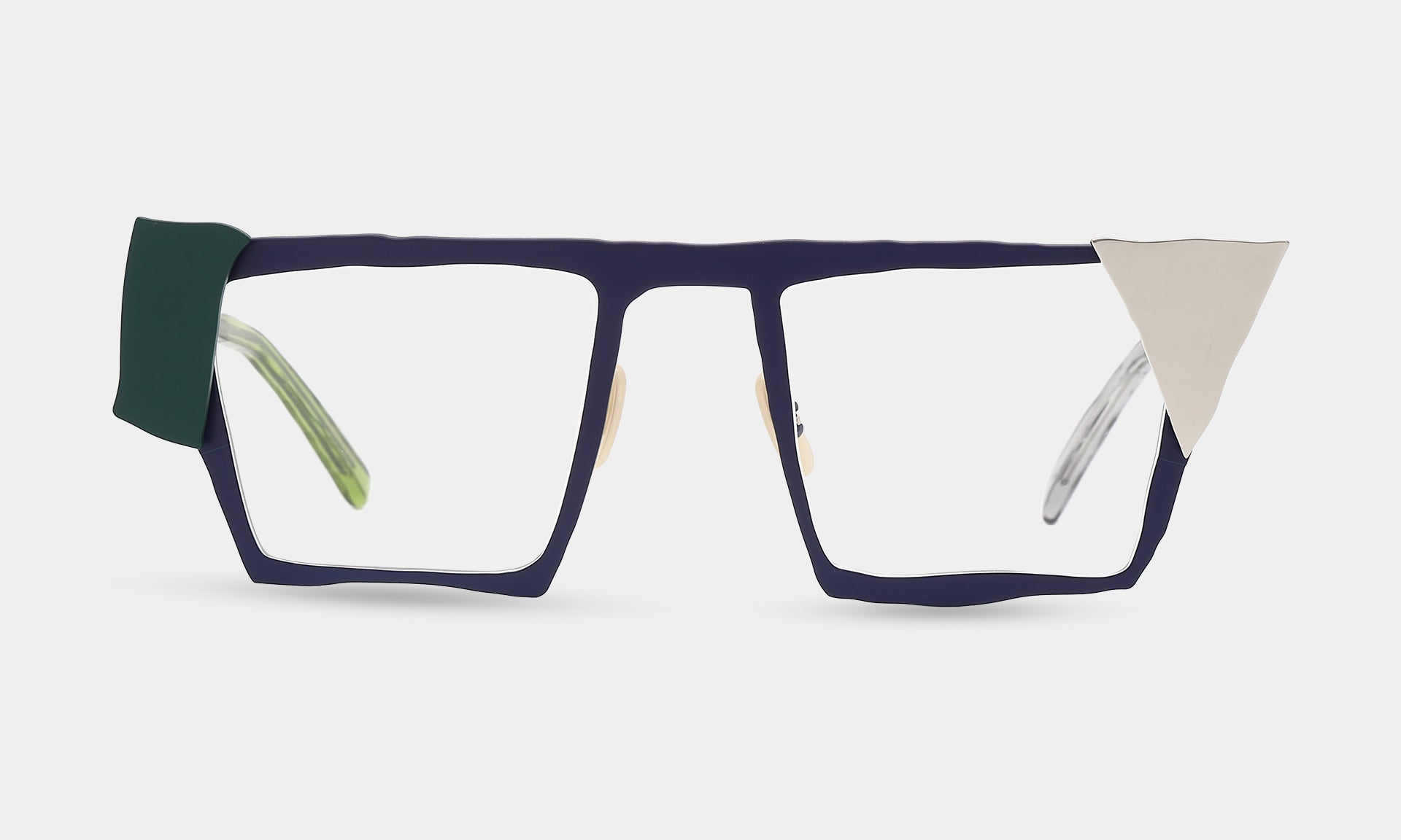 一つひとつのパーツを積み重ねる実験的なデザイン。ヨロイやブリッジを積み木の様に自由に置いてみる。それが構造となりメガネを作り出しています。色や素材感の違うパーツが組み合わさることで、複雑な色彩とだまし絵のような錯覚を生み出します。