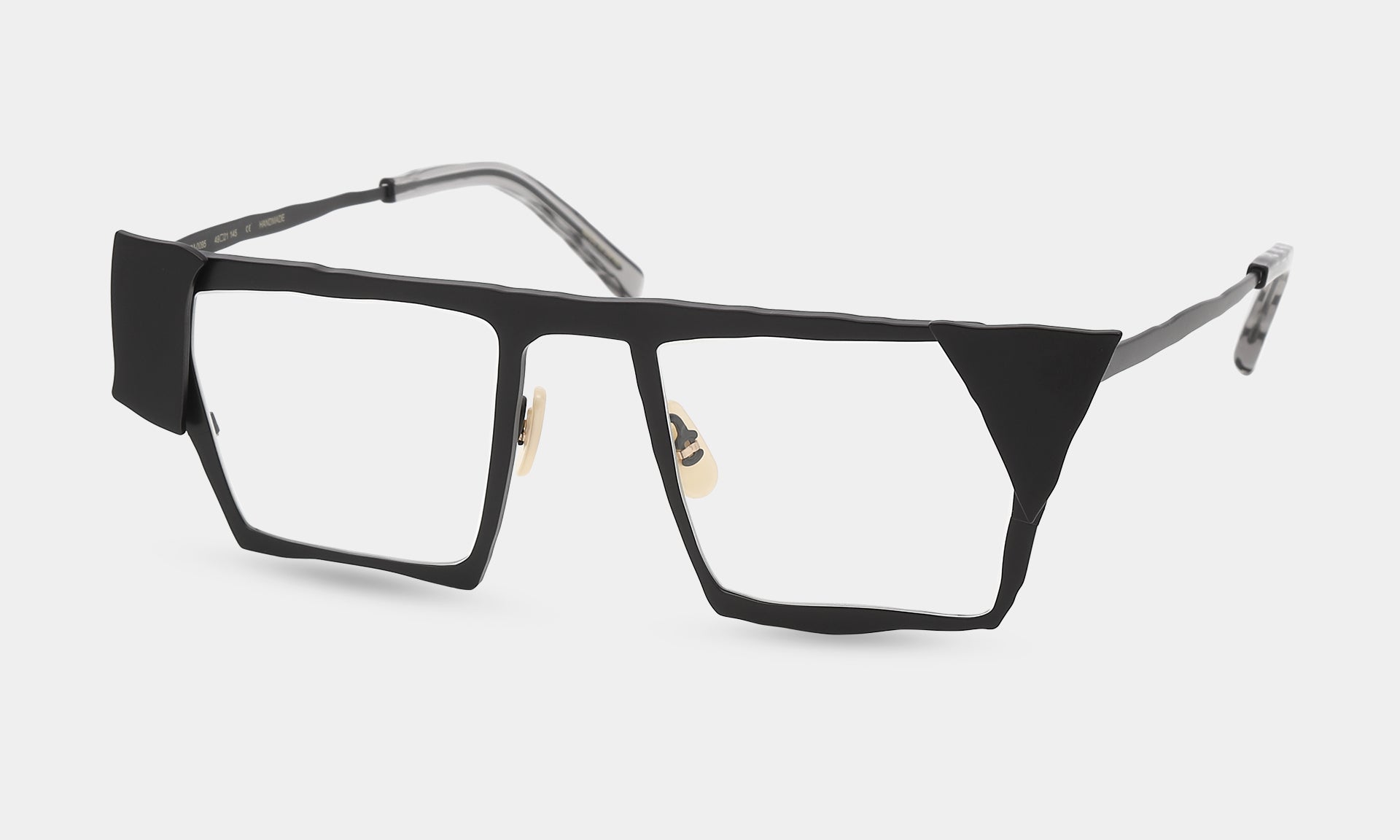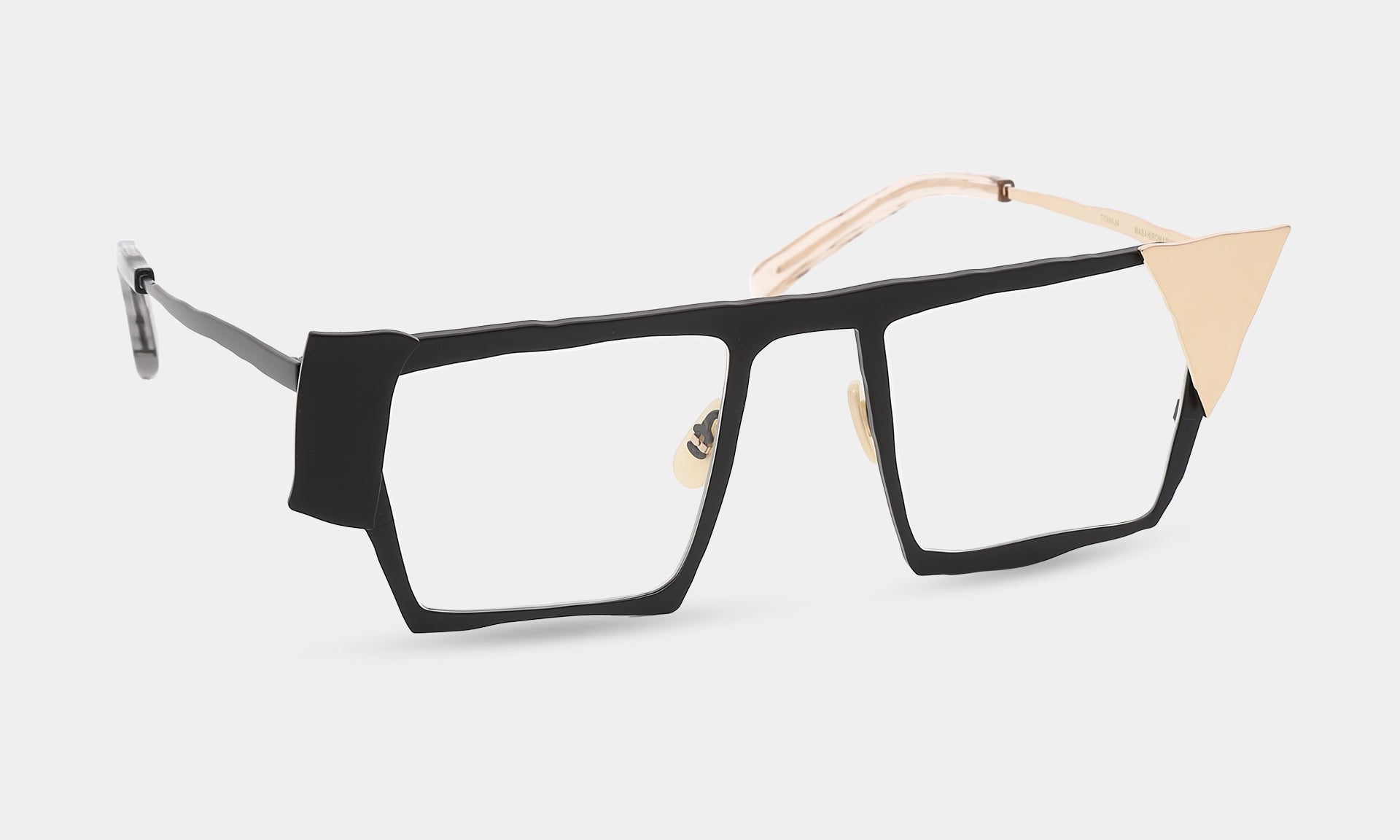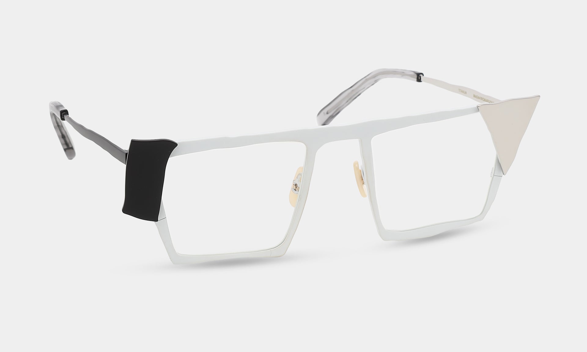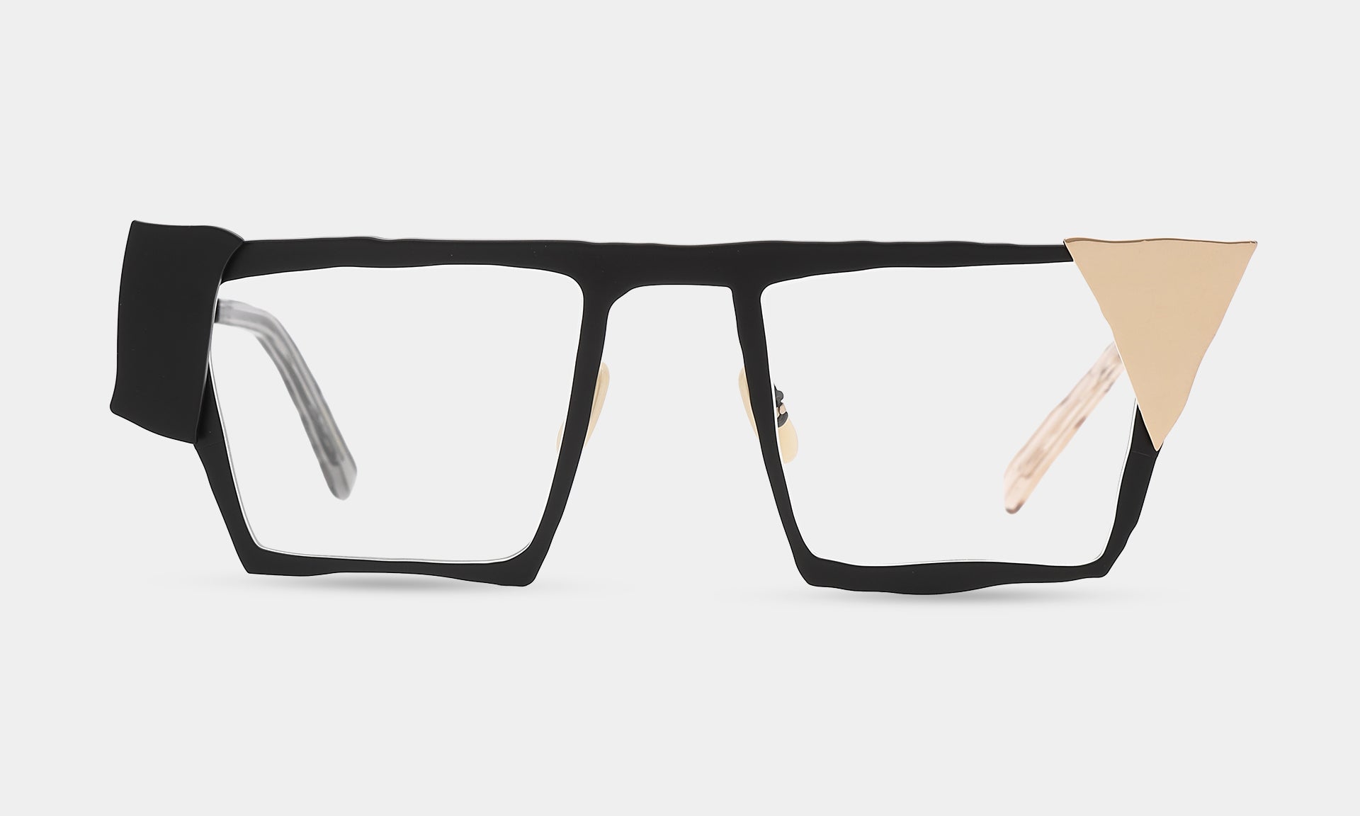 一つひとつのパーツを積み重ねる実験的なデザイン。ヨロイやブリッジを積み木の様に自由に置いてみる。それが構造となりメガネを作り出しています。色や素材感の違うパーツが組み合わさることで、複雑な色彩とだまし絵のような錯覚を生み出します。